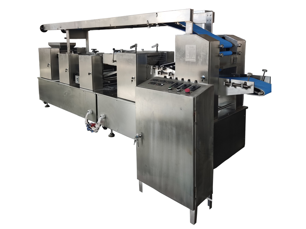 制皮機為臥式成型機,通過傳送機構將各道軋輥線速度比合理分配,實現(xiàn)從投料到制皮成型自動化生產。適用于餃子皮、餛飩皮、燒麥皮、蒸餃皮、以及燙面類面皮成型。